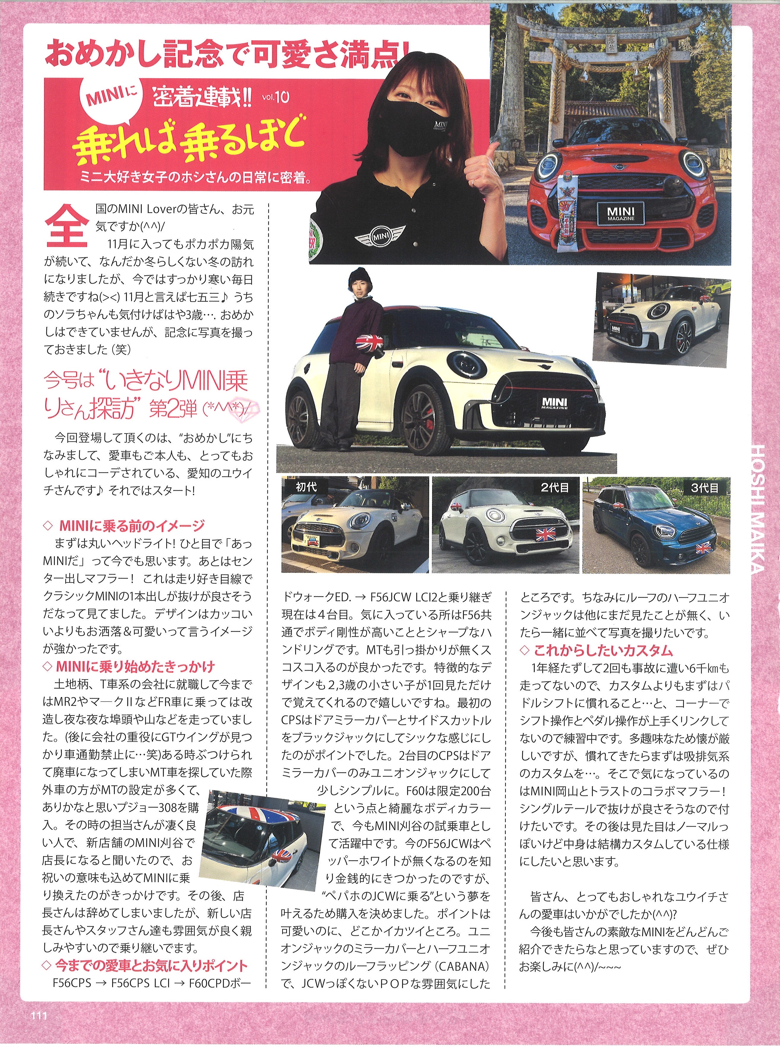 vol.41では静岡県の加盟店でのコラボカーの展示の模様を掲載いただきました。ボディカラーに合わせた個性的なカラーリングのシートカバーが目を引くR56JCW、R57クーパー、R56クーパーSのコラボになりました。